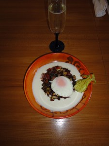 Caponatina di Zucchine Romane e Coppa – Roman Courgette Caponata with Pecorino Romano dressing, Coppa di Testa and poached egg on top