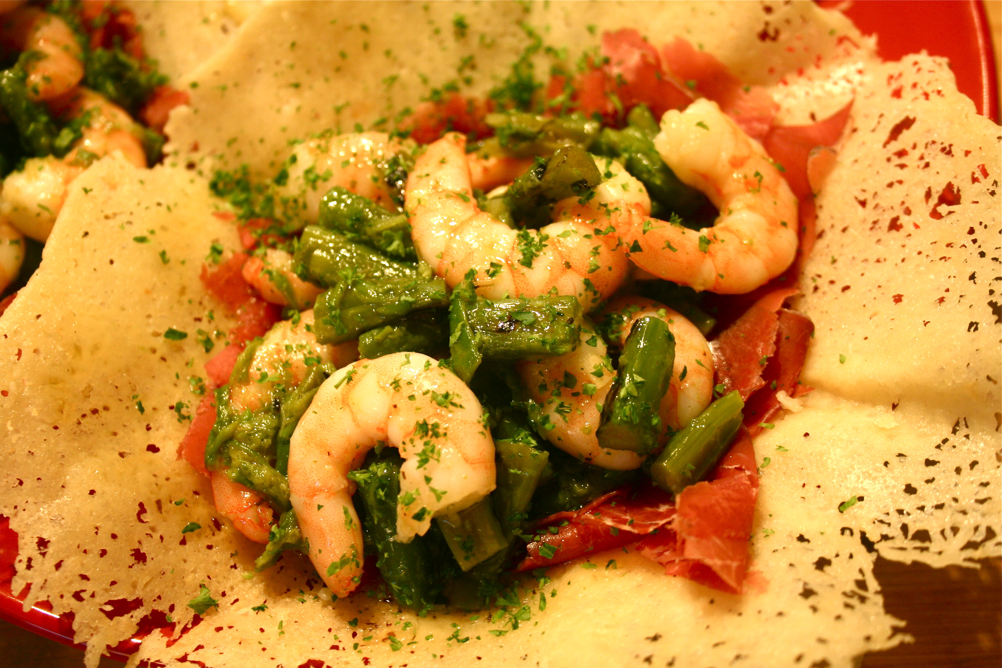 | CESTINI DI MANCHEGO CON BRESAOLA Y GAMBAS | Manchego cheese baskets filled with char-grilled marinated asparagus, prawn and Breasaola – cured and spiced beef fillet;